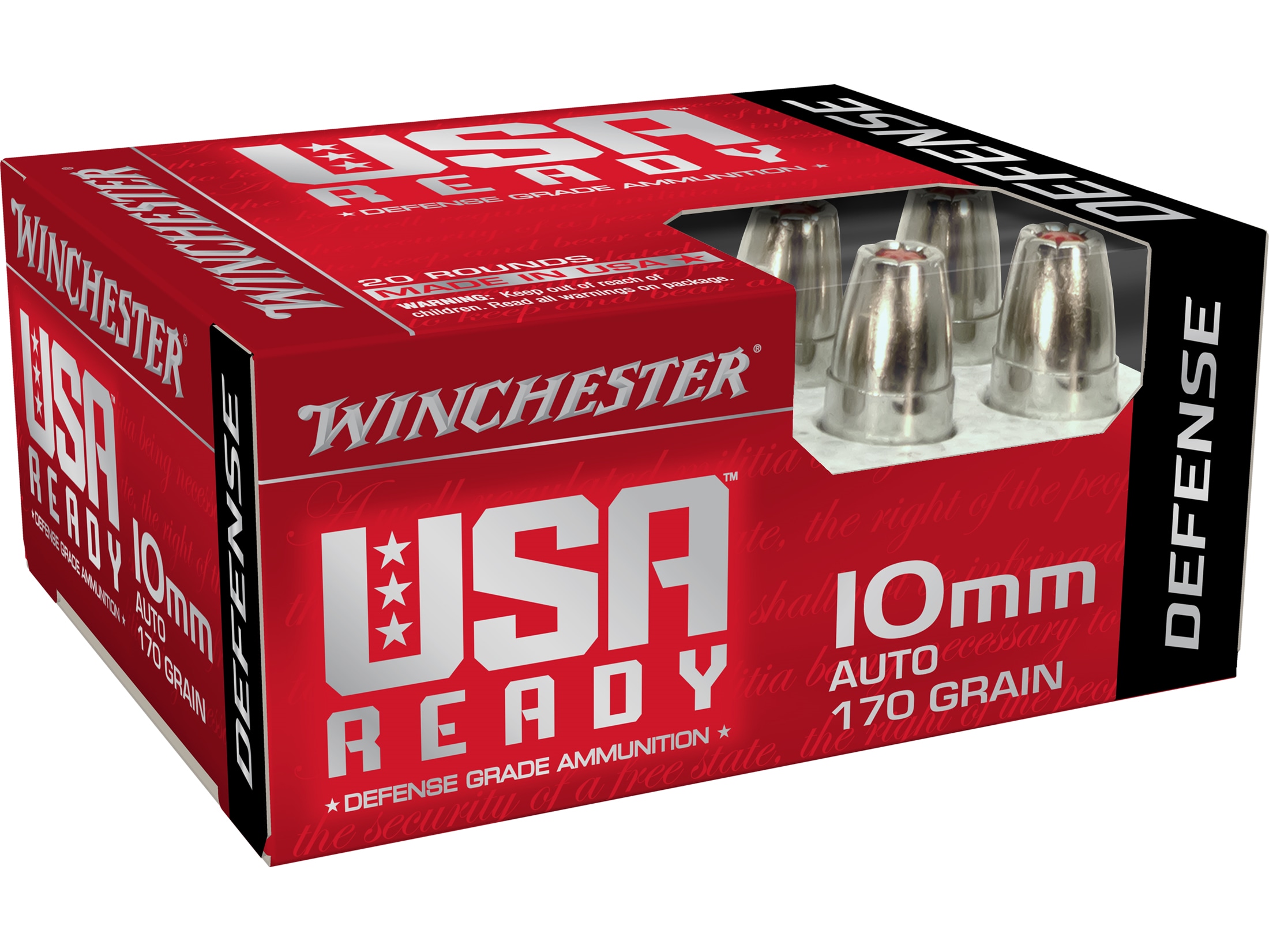 Winchester USA Ready Defense 10mm Auto Ammo 170 Grain Hex-Vent Jacketed Hollow Point Box of 20